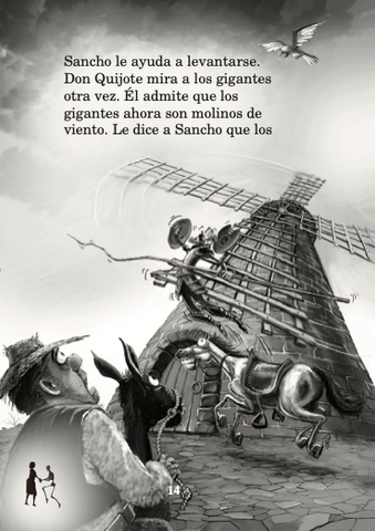 Don Quijote, el último caballero is an amusing, ironic and — at the same time — tragic story. Don Quijote is an ordinary Spaniard with an extraordinary imagination who believes that he must achieve great feats to honor a lady. He falls in love with a waitress that he considers to be the ideal lady. He and his companion Sancho Panza have adventures in which Don Quijote is always mistaken about what he finds along the way while Sancho sees what is really there. The story is based on Miguel de Cervantes The Ingenious Gentleman Don Quixote of La Mancha, published in the 17th century. Many consider it to be the best book of fiction ever written.