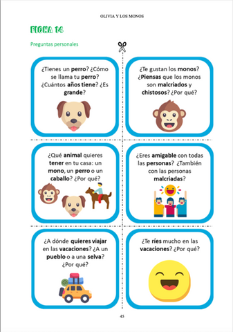 GUÍA COMPLETA DEL MAESTRO – OLIVIA Y LOS MONOS is a truly comprehensive and complete teacher’s guide. Olivia y los monos has 7 chapters. This guide about 15 activities per chapter for you to choose. Yes, you got that right! It even has activities for before reading the book.
